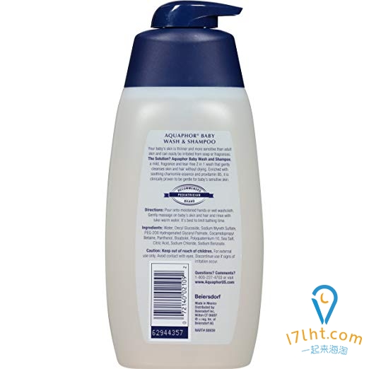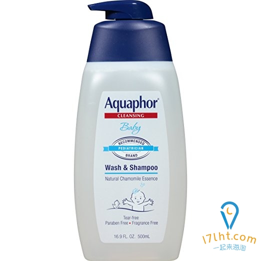 凑单Aquaphor天然温和洗发沐浴2合1 500ml Baby Wash & Shampoo 16.9 Fluid Ounce - Pediatrician Recommended Brand,采用超级温和配方,经过美国小儿科医生测试证明,无泪配方,不会引起过敏,成人极度敏感肤质亦适用。不含香精,不含皂质,温和且持久保湿。能够改善皮肤的干燥肤质,有效缓解干燥引起的皮肤起皮,缓解干性湿疹。内含天然甘菊成分,可舒缓肌肤。
